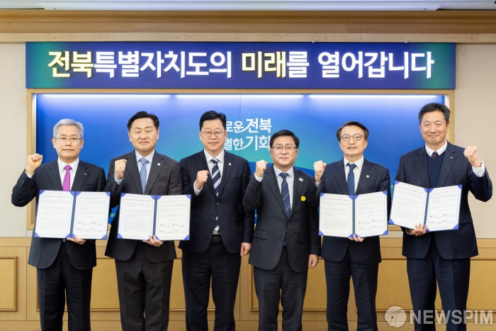 [서울=뉴스핌] 김성환 기후에너지환경부 장관이 9일 전북 전주시 소재 전북특별자치도청에서 새만금 수상태양광 적기 연계를 위한 기관간 업무협약을 체결을 마치고 참여 기관 대표들과 함께 기념촬영을 하고 있다.(왼쪽부터 김동철 한국전력공사 사장, 김관영 전북특별자치도지사, 안호영 국회 기후에너지환경노동위원회 위원장, 김성환 기후에너지환경부장관, 김의겸 새만금개발청장, 전대욱 한국수력원자력 사장)[사진= 기후에너지환경부] 2026.02.09 photo@newspim.com
