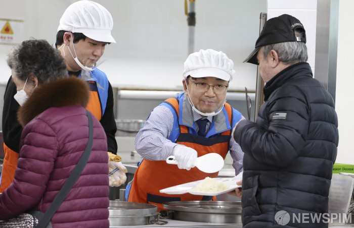 [서울=뉴스핌]김광용 행정안전부 재난안전관리본부장이 9일 오전 설 명절을 앞두고 대전 동구 행복한어르신복지관 식당에서 어르신들을 대상으로 배식 봉사활동을 하고 있다.[사진= 행정안전부] 2026.02.09 photo@newspim.com