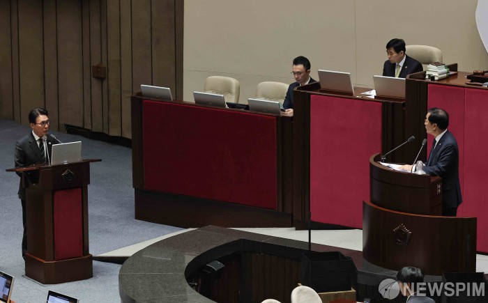 [서울=뉴스핌] 윤창빈 기자 = 김민석 국무총리가 9일 오후 서울 여의도 국회에서 열린 정치·외교·통일·안보에 관한 대정부질문에서 답변하고 있다. 2026.02.09 pangbin@newspim.com