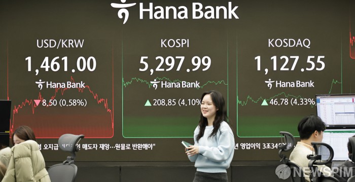 [서울=뉴스핌] 양윤모 기자 = 미국발 훈풍에 힘입어 9일 오후 코스피가 전장 종가보다 208.90 포인트(4.10%) 상승하며 5298.04로, 코스닥은 46.78 포인트(4.33%) 상승한 1127.25 로 거래를 마감한 가운데, 서울 중구 하나은행본점 딜링룸에서 직원들이 업무를 보고 있다. 서울외환시장에서 달러/원 환율은 전장 대비 8.50원 하락한 1461.00원에 주간거래를 마감했다. 2026.02.09 yym58@newspim.com