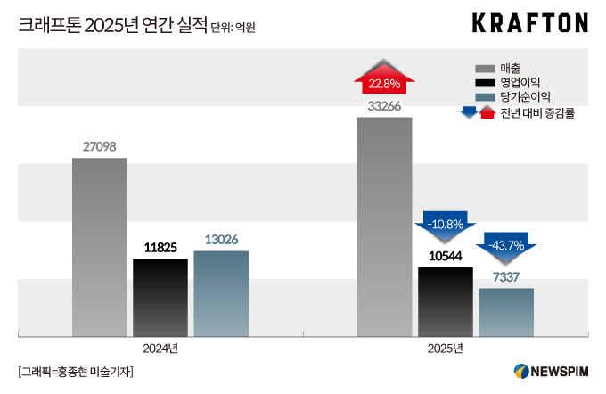 9일 크래프톤은 2025년 연간 매출 3조3266억원, 영업이익 1조544억원, 당기순이익 7337억원을 기록했다고 공시했다. 전년 대비 매출은 22.8% 늘며 창사 이래 최고치를 경신했다. 영업이익과 당기순이익은 일본 ADK 인수 및 일회성 비용 등의 영향으로 10.8%, 43.8% 줄었다.