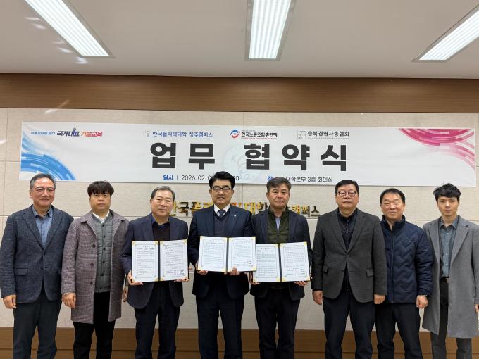 [대전=뉴스핌] 오영균 기자 = 한국폴리텍대학 청주캠퍼스는 9일 오전 11시 대학본부 3층 회의실에서 한국노총 충북지역본부, (사)충북경영자총협회와 충북지역 산업 수요 기반 전문기술인력 양성 및 취업·고용 연계 강화를 위한 산학협력 업무협약(MOU)을 체결했다.