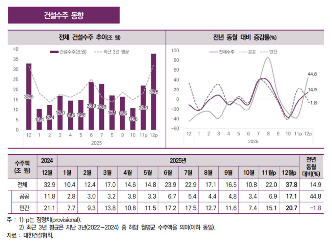 10일 한국건설산업연구원(이하 '건산연')은 지난해 12월 건설수주가 37조8000억원으로 전년 동월 대비 14.9% 증가했다고 밝혔다. 최근 3년 평균보다 5조3000억원 높은 수준으로, 연말 공공 발주 집중의 영향이 크게 작용한 결과다.