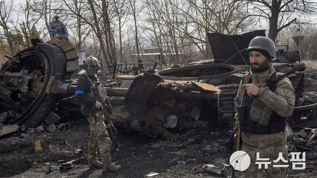 지난 2022년 3월 27일(현지 시간) 우크라이나 키이우 외곽 마을에서 우크라이나군 병사가 파괴된 러시아군 전차 앞에 서 있다. 왼쪽에 있는 특수부대원이 야간투시경(DTNVS)을 착용하고 있다. 사진=로이터 연합뉴스 [사진=이스라엘 공군] 2025.10.09 gomsi@newspim.com