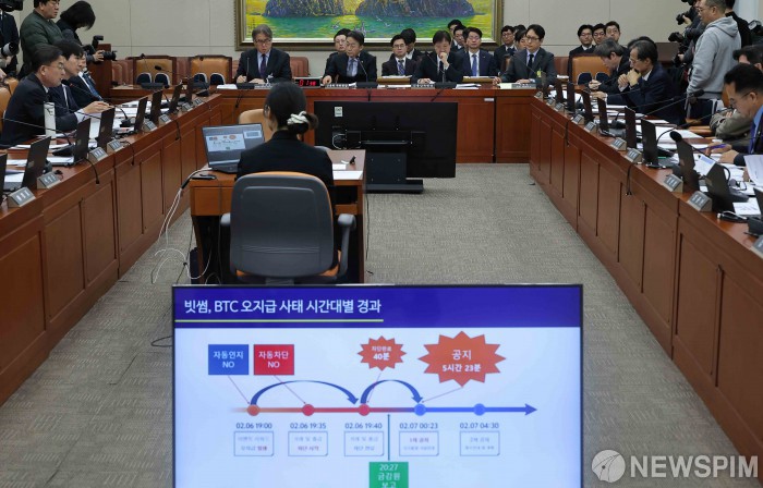 [서울=뉴스핌] 윤창빈 기자 = 이재원 빗썸 대표가 11일 오전 서울 여의도 국회 정무위원회에서 열린 빗썸 비트코인 오지급 사고와 관련한 긴급 현안질의에서 의원 질문에 답변하고 있다. 2026.02.11 pangbin@newspim.com
