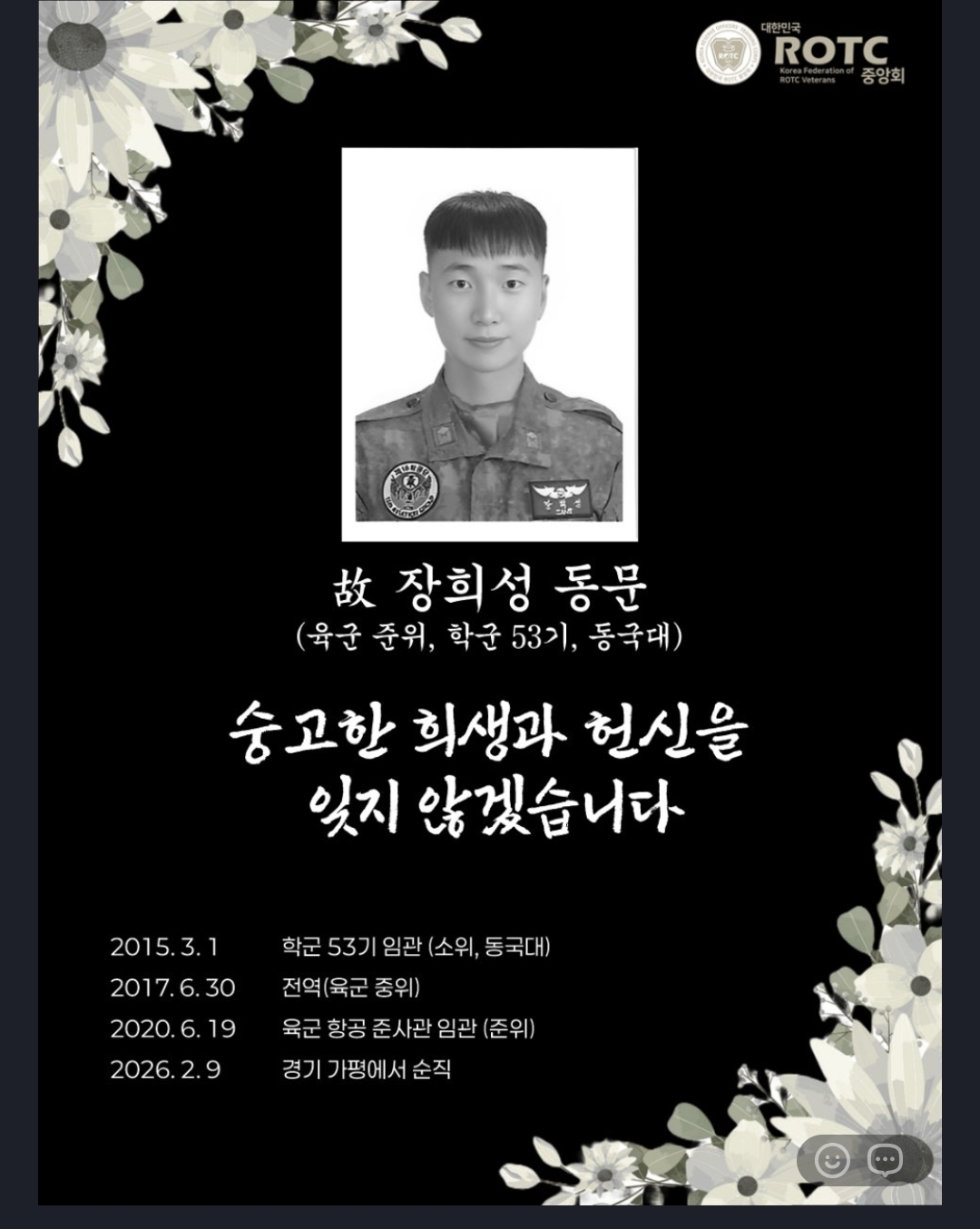 육군과 ROTC 중앙회 등에 따르면, 고 장 준위는 2015년 3월 학군(ROTC) 53기 정훈장교로 소위 임관해 2년 4개월간 복무하다 2017년 6월 전역했다. 이후 장 준위는 2020년 6월 육군 항공준사관으로 다시 임관해 AH-1S 공격헬기 조종사로 전역 없는 군 생활을 이어왔다.
