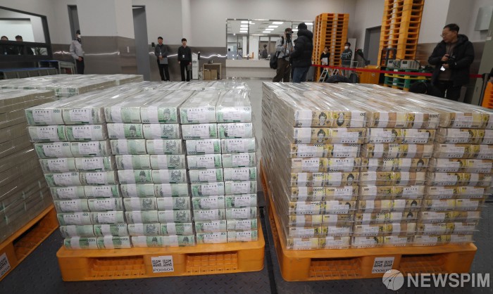 [서울=뉴스핌] 사진공동취재단= 설날을 앞둔 11일 서울 중구 한국은행 본점에서 현금 운송 관계자들이 시중은행에 공급될 설 자금 방출 작업을 하고 있다. 2026.02.11 photo@newspim.com
