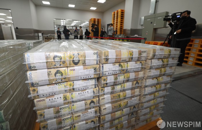 [서울=뉴스핌] 사진공동취재단= 설날을 앞둔 11일 서울 중구 한국은행 본점에서 현금 운송 관계자들이 시중은행에 공급될 설 자금 방출 작업을 하고 있다. 2026.02.11 photo@newspim.com