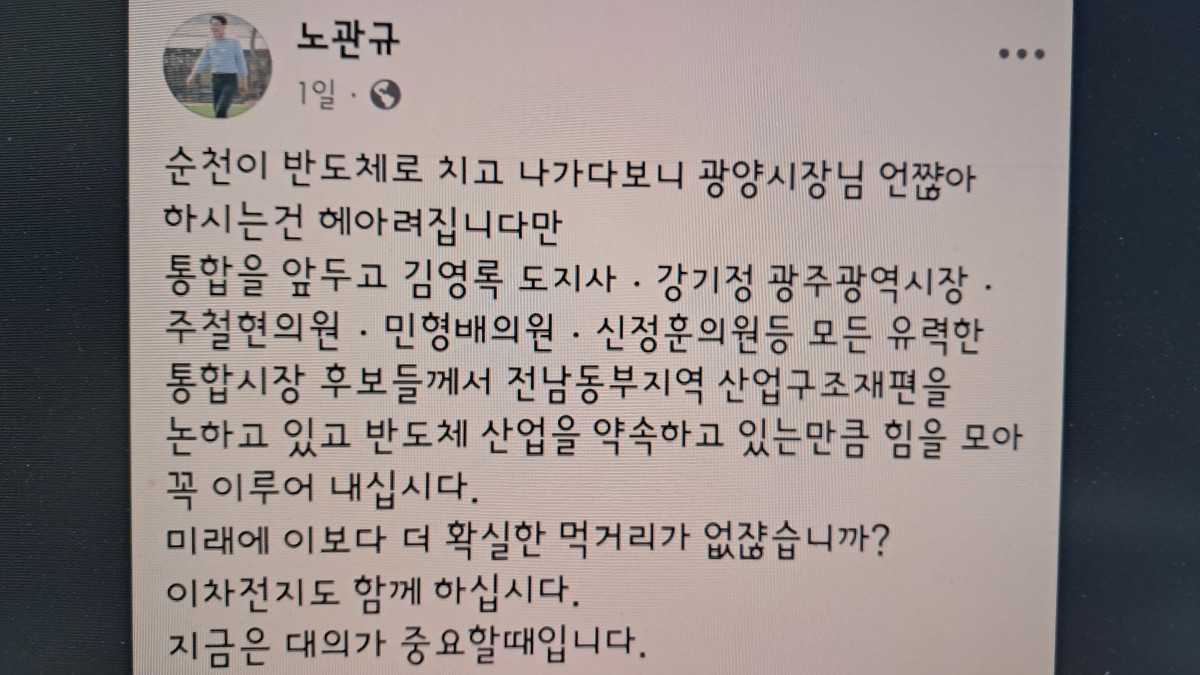 노관규 시장 SNS 게시글 "순천이 반도체로 치고 나가다 보니 광양시장님 언짢아하시는 건 헤아려집니다만" [사진=노관규 SNS 갈무리] 2026.02.12 chadol999@newspim.com