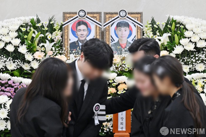 [성남=뉴스핌] 사진공동취재단 = 12일 오전 경기 성남시 분당구 국군수도병원 장례식장에서 엄수된 코브라 헬기 추락으로 순직한 고(故) 정상근(영정 왼쪽)‧장희성 준위 영결식에서 유족들이 고인을 떠나보내며 눈물을 흘리고 있다. 2026.02.12 photo@newspim.com