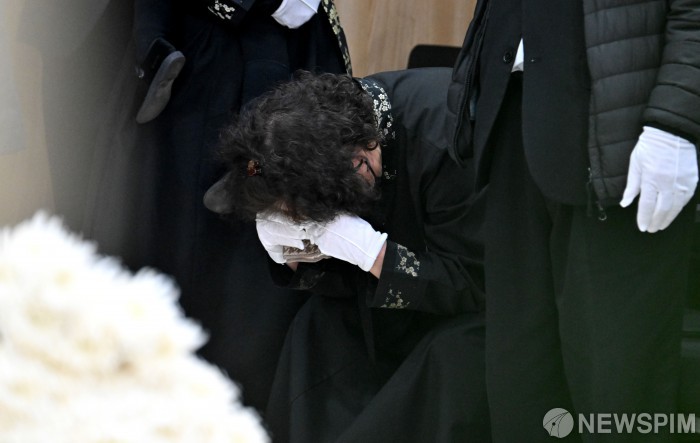 [성남=뉴스핌] 사진공동취재단 = 12일 오전 경기 성남시 국군수도병원 영결식장에서 열린 육군 항공기 사고 순직자에 대한 영결식에서 순직자 유가족들이 오열하고 있다. 2026.02.12 photo@newspim.com