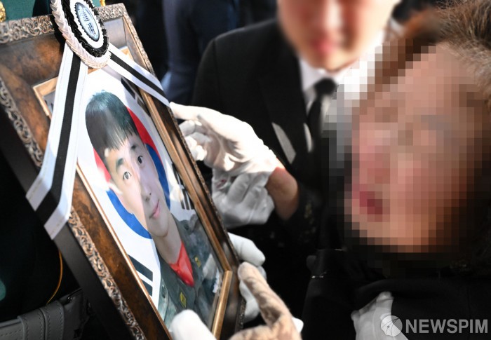 [성남=뉴스핌] 사진공동취재단 = 12일 오전 경기 성남시 국군수도병원 영결식장에서 열린 육군 항공기 사고 순직자에 대한 영결식에서 장희성 준위의 유가족이 오열하고 있다. 2026.02.12 photo@newspim.com