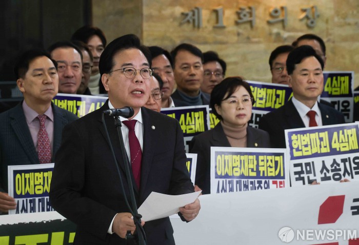 [서울=뉴스핌] 윤창빈 기자 = 송언석 국민의힘 원내대표가 12일 서울 여의도 국회 로텐더홀에서 열린 4심제 위헌악법 규탄대회에서 규탄사를 하고 있다. 2026.02.12 pangbin@newspim.com