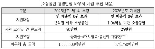 정부는 연매출 1억400만원 미만 소상공인에게 전기·수도·가스요금과 4대 보험료, 차량 연료비, 전통시장 화재 공제료 등에 사용할 수 있는 바우처를 최대 25만원 지급한다. 바우처는 신용·체크·선불카드에 지급하며, 카드로 사용처에 결제하면 별도 증빙 없이 자동 차감되는 방식이다.