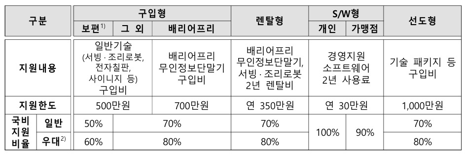 하드웨어 분야에서는 장비 구매비를, 소프트웨어 분야에서는 임차비를 각각 지원한다. 신청은 '소상공인24'를 통해 온라인으로 가능하다.