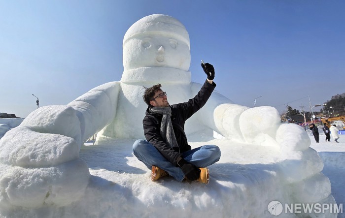 [서울=뉴스핌] 13일 평창군 대관령면 횡계리 송천 일대 축제장에서 개막한 전국 최고의 눈과 얼음축제인 '제34회 평창 대관령눈꽃축제'를 찾은 외국인 방문객이 눈조각을 배경으로 기념사진을 촬영하고 있다. 밀라노-코르티나 동계올림픽 개최 시기에 맞춰 ‘동계 꿈나무 눈동이의 국가대표 성장기’를 주제로 열리는 올해 축제는 방문객들에게 다양한 눈과 얼음조각, 겨울 체험거리를 제공한다. 축제장 곳곳에는 대형 눈썰매장과 눈·얼음조각, 아이스카페 등이 조성돼 멋진 눈과 얼음조각 감상과 휴식을 취할 수 있고 크로스컨트리스키, 컬링, 바이애슬론 등 동계종목 체험 프로그램도 운영된다. [사진=평창관광문화재단] 2026.02.13 photo@newspim.com