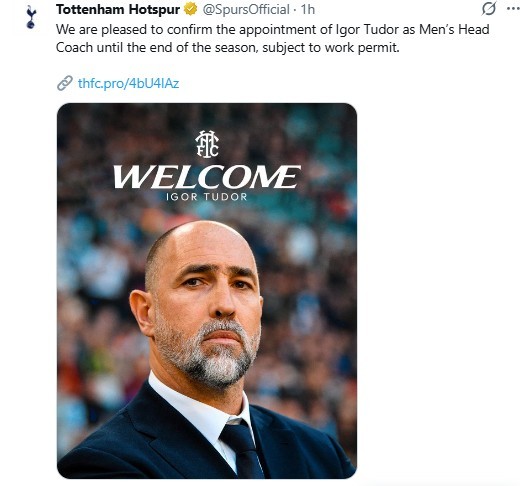토트넘은 14일 이고르 투도르를 2025-2026시즌 종료까지 팀을 이끌 임시 감독으로 선임했다고 발표했다. 구단은 "투도르 감독은 경기력 향상과 결과 도출, 프리미어리그 순위 상승이라는 명확한 목표를 안고 합류했다"며 "시즌의 중요한 시기에 조직력과 투지, 경쟁력을 불어넣는 것이 그의 임무"라고 설명했다.