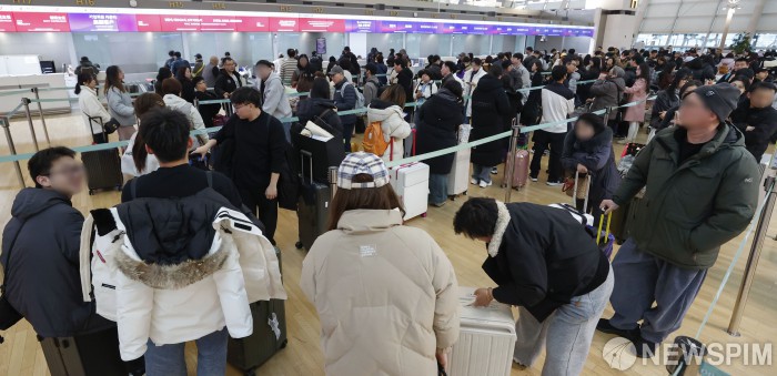 [영종도=뉴스핌] 류기찬 기자 = 설 연휴를 맞이한 15일 오전 인천국제공항 제1여객터미널이 여행객들로 북적이고 있다. 2026.02.15 ryuchan0925@newspim.com