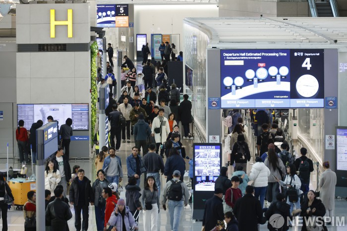 [영종도=뉴스핌] 류기찬 기자 = 설 연휴를 맞이한 15일 오전 인천국제공항 제1여객터미널이 여행객들로 북적이고 있다. 2026.02.15 ryuchan0925@newspim.com