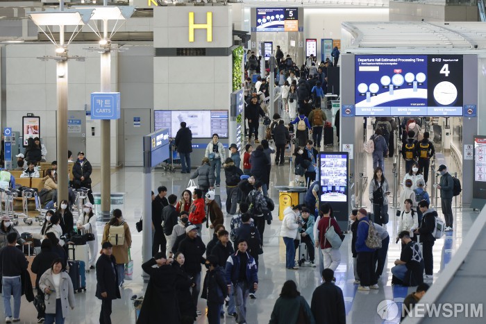 [영종도=뉴스핌] 류기찬 기자 = 설 연휴를 맞이한 15일 오전 인천국제공항 제1여객터미널이 여행객들로 북적이고 있다. 2026.02.15 ryuchan0925@newspim.com