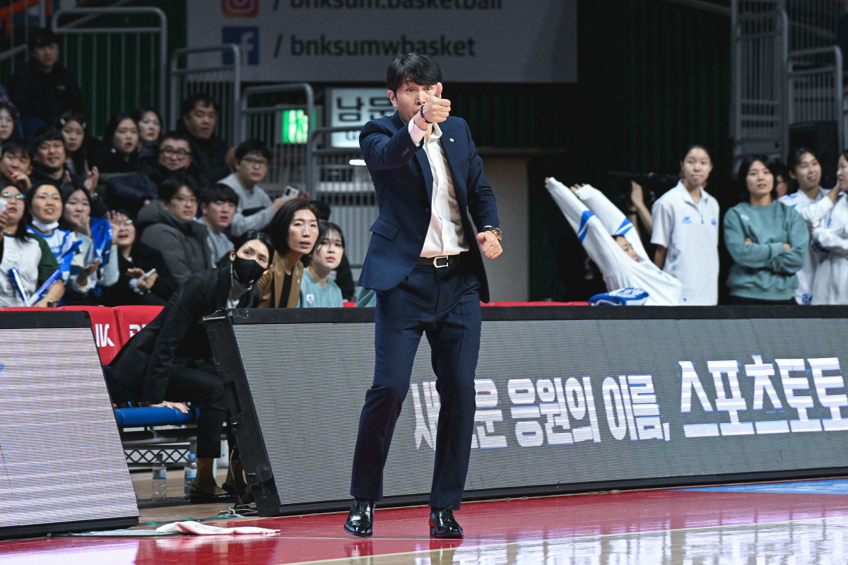 [아산=뉴스핌]이웅희 기자=우리은행 위성우 감독이 선수들의 움직임을 잡아주고 있다. [사진=WKBL] 2026.02.15 iaspire@newspim.com