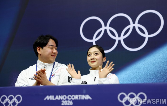 [밀라노=로이터뉴스핌] 밀라노 코르티나 2026 올림픽에 출전한 피겨스케이팅 선수 신지아가 18일 이탈리아 밀라노 아이스 스케이팅 아레나에서 쇼트 프로그램 연기를 마치고 팬들과 인사를 나누고 있다. 2026.02.18 photo@newspim.com