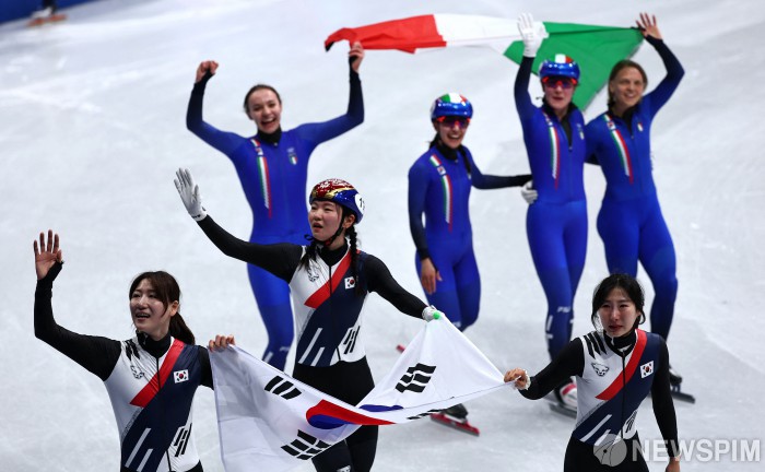 [밀라노=로이터뉴스핌] 밀라노 코르티나 2026 올림픽에 출전한 쇼트트랙 대한민국 여자 대표팀이 지난 18일 이탈리아 밀라노 아이스 스케이팅 아레나에서 열린 3000m 계주 시상식에서 금메달을 획득하고 기뻐하고 있다. 2026.02.19 photo@newspim.com