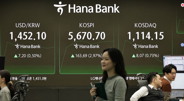 한국거래소에 따르면 이날 오전 9시 17분 기준 코스피 지수는 전 거래일 대비 152.49포인트(2.77%) 오른 5659.50에 거래되고 있다. 지수는 전 거래일보다 135.08포인트(2.45%) 오른 5642.09에 출발한 뒤 상승 폭을 키우고 있다. 개인이 4920억원을 순매수하는 가운데 외국인과 기관은 각각 4028억원, 1235억원을 순매도 중이다.
