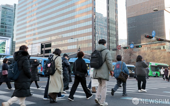 [서울=뉴스핌] 이길동 기자 = 설 연휴가 끝난 19일 오전 서울 종로구 광화문 사거리에서 시민들이 출근길을 서두르고 있다. 2026.02.19 gdlee@newspim.com