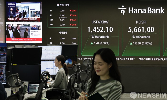 [서울=뉴스핌] 양윤모 기자= 19일 오전 코스피가 전장 종가보다 153.99포인트(2.80%) 상승하며 5661.00로, 코스닥은 6.96 포인트(0.63%) 상승한 1113.04로 거래를 시작한 가운데, 서울 중구 하나은행본점 딜링룸에서 직원들이 업무를 보고 있다. 서울외환시장에서 달러/원 환율은 전장 대비 7.20원 상승한 1452.10원에 주간거래를 시작했다. 2026.02.19 yym58@newspim.com