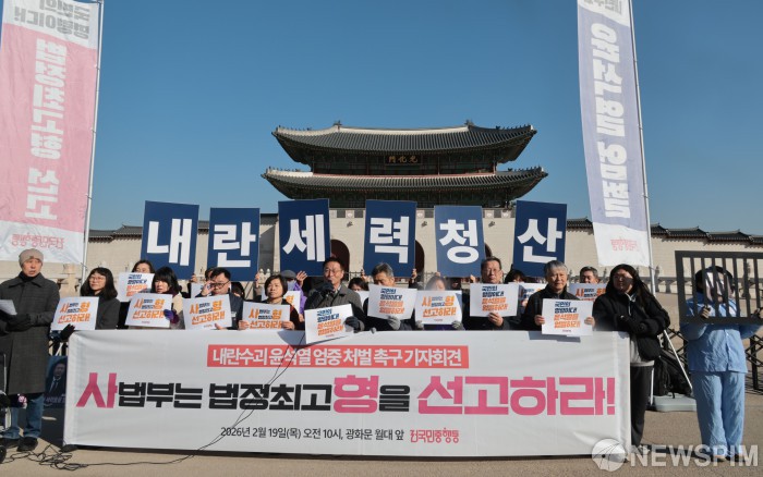 [서울=뉴스핌] 이길동 기자 = 전국민중행동 관계자들이 19일 오전 서울 종로구 광화문 월대 앞에서 내란 수괴 윤석열의 엄중한 처벌을 촉구하는 기자회견을 하고 있다. 2026.02.19 gdlee@newspim.com