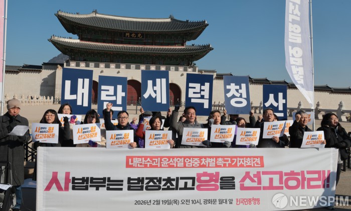 [서울=뉴스핌] 이길동 기자 = 전국민중행동 관계자들이 19일 오전 서울 종로구 광화문 월대 앞에서 내란 수괴 윤석열의 엄중한 처벌을 촉구하는 기자회견을 하고 있다. 2026.02.19 gdlee@newspim.com