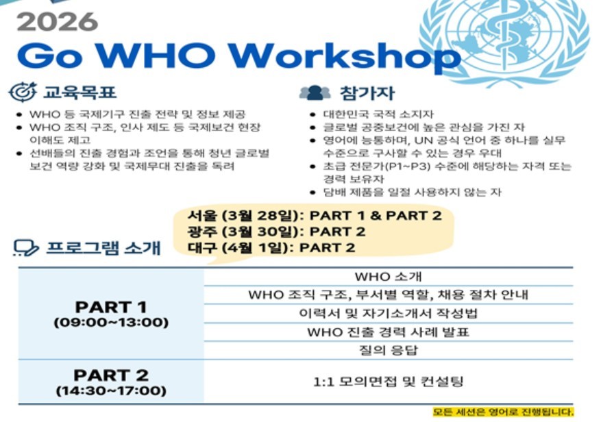 이번 워크숍은 오는 3월 28일부터 4월 1일까지 서울, 광주, 대구에서 개최된다. 보건 분야 국제기구 진출을 희망하는 대한민국 청년들에게 진출 관련 정보를 적극적으로 제공하기 위해 기획됐다.