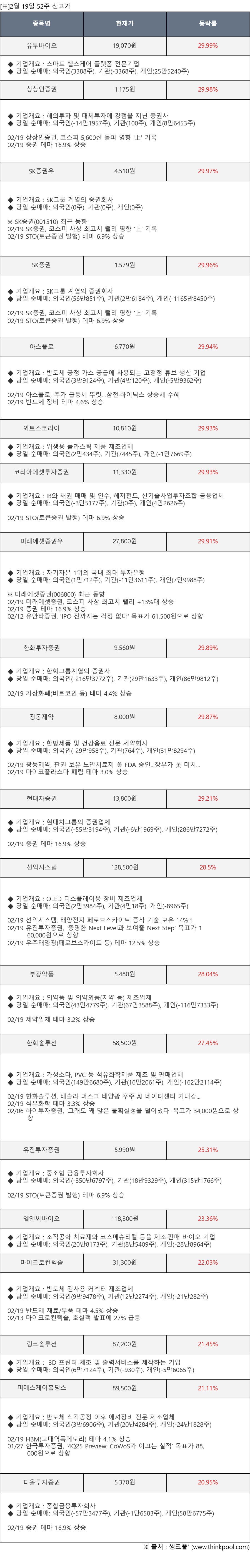 [표]2월 19일 52주 신고가 종목 및 최근 동향