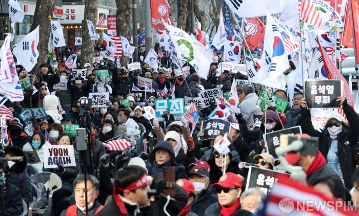 [서울=뉴스핌] 정일구 기자 = 윤석열 전 대통령의 내란 우두머리 혐의에 대한 1심 선고기일인 19일 오후 서울 서초구 서울중앙지방법원 인근에서 윤 전 대통령 지지자들이 공소 기각을 촉구하는 집회를 하고 있다. 2026.02.19 mironj19@newspim.com