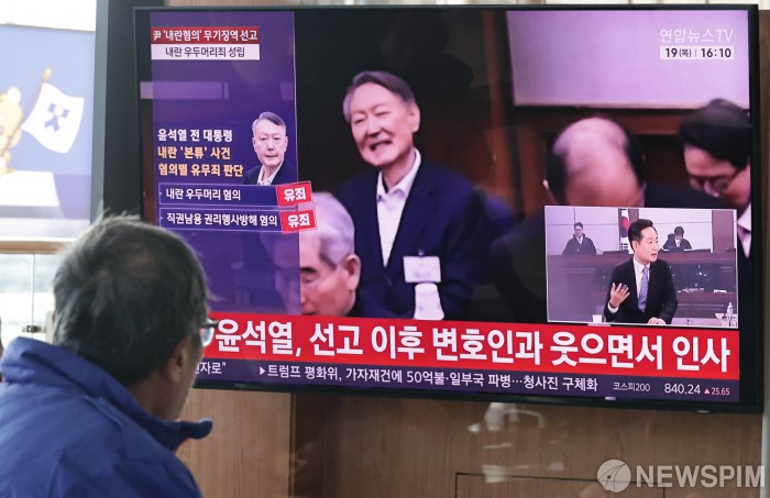 [서울=뉴스핌] 양윤모 기자 = 19일 오후 서울역을 찾은 시민들이 12·3 비상계엄 내란 우두머리 혐의로 기소된 윤석열 전 대통령의 1심 무기징역 선고방송을 시청하고 있다. 서울중앙지법 형사합의25부(지귀연 부장판사)는 이날 417호 대법정에서 윤 전 대통령의 내란 우두머리 혐의에 대해 444일만에 특검의 구형에 못미치는 무기징역을 선고했다. 2026.02.19 yym58@newspim.com