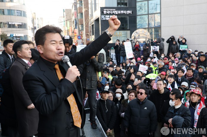 [서울=뉴스핌] 정일구 기자 = 윤석열 전 대통령의 내란 우두머리 혐의에 대한 1심 선고기일인 19일 오후 서울 서초구 서울중앙지방법원 인근에서 열린 윤 전 대통령 지지자 집회에서 한국사 강사 출신 보수 유튜버 전한길 씨가 선고 결과 관련 발언하고 있다. 2026.02.19 mironj19@newspim.com