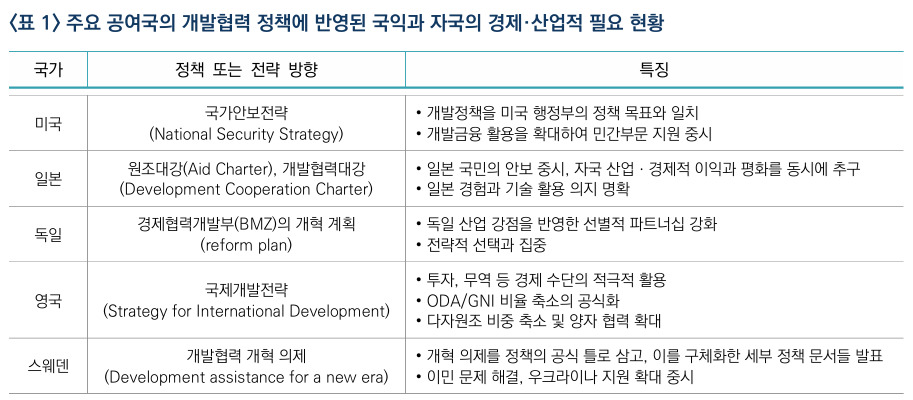 이 같은 주요국들의 추세를 보면, ODA가 '도덕적 의무'에서 '전략적 수단'으로 재정의되고 있다는 해석이 나온다. 국가별 접근 방식에는 차이가 있지만, 공통적으로 ODA를 외교·통상·산업 정책과 결합해 자국 기업의 해외 진출과 전략 산업 협력 등으로 연결하려는 흐름이 뚜렷하다. 총량은 줄이되 전략적 가치가 높은 분야와 국가에 집중하는 '선별적 원조'가 새로운 표준으로 자리 잡고 있다는 평가다.
