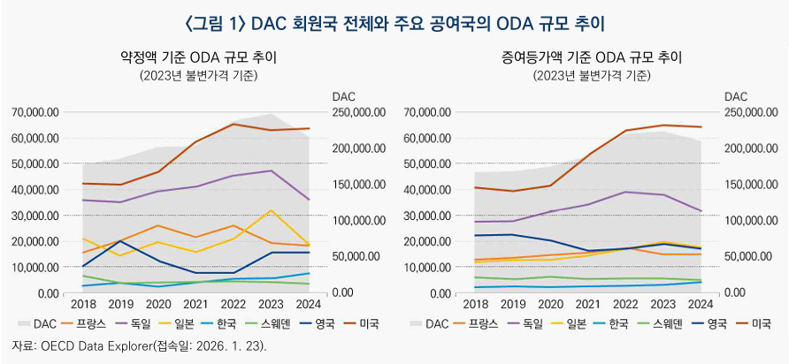 이 같은 정책 변화는 실제 ODA 실적에도 반영되고 있다. 경제협력개발기구(OECD) 개발원조위원회(DAC) 통계에 따르면, 약정액 기준 ODA 규모는 2023년 2481억달러에서 2024년 2161억달러로 12.9% 감소했다. 증여등가액 기준으로도 2234억달러에서 2100억달러로 6.0% 줄었다 .