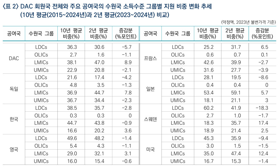 지원 대상도 변하고 있다. DAC 회원국의 최근 2년(2023~2024년) 평균 최빈국(LDCs) 지원 비중은 30.6%로, 10년 평균(36.3%)보다 5.7%포인트(p) 낮아졌다. 반면 하위중소득국(LMICs) 비중은 38.1%에서 47.0%로 8.9%p 상승했다 .