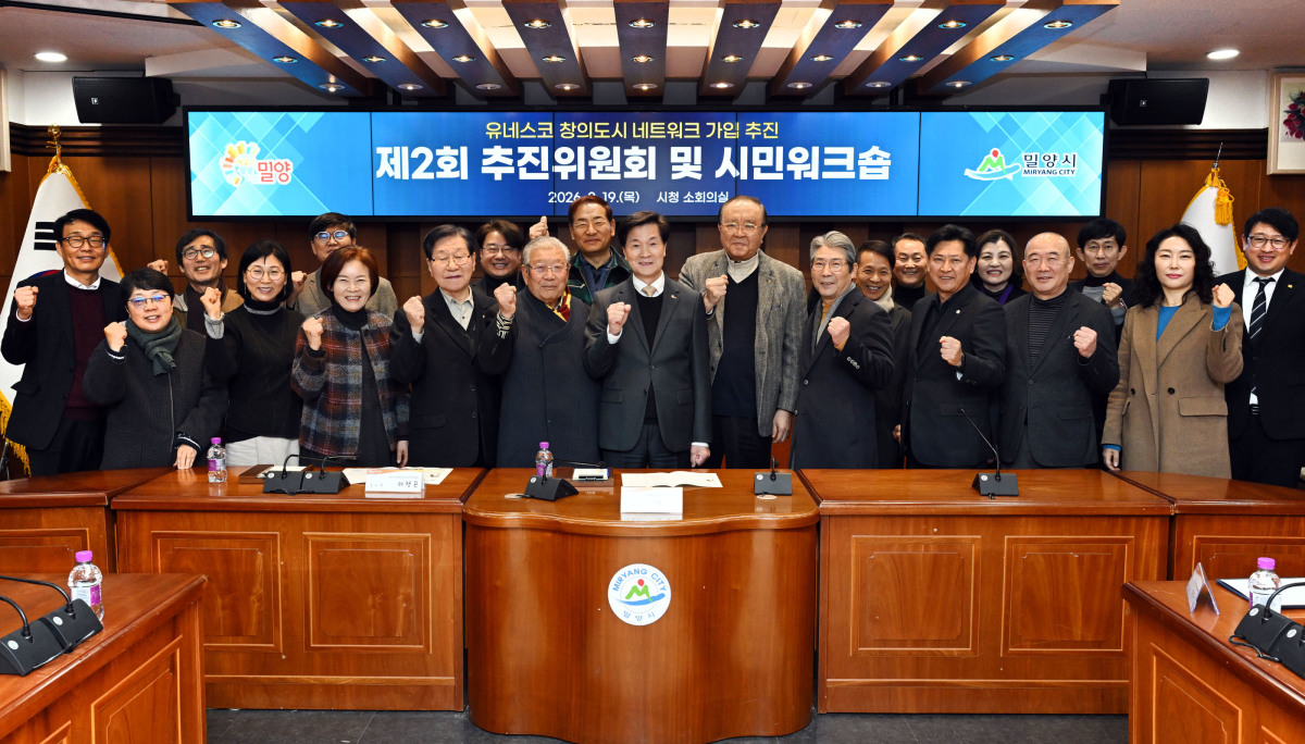 경남 밀양시 유네스코 창의도시 추진위원회 위원들이 지난 19일 시청 소회의실에서 열린 제2회 위원회 회의에서 기념촬영을 하고 있다.[사진=밀양시] 2026.02.20