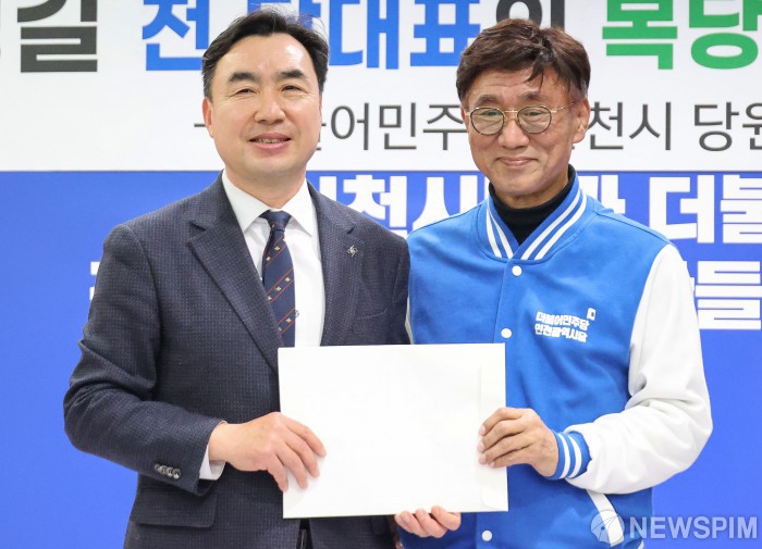 [인천=뉴스핌] 류기찬 기자 = 윤관석 전 더불어민주당 의원이 20일 오후 인천 남동구 더불어민주당 인천광역시당에서 복당 원서를 고남석 더불어민주당 인천광역시당 위원장에게 제출하고 있다. 2026.02.20 ryuchan0925@newspim.com
