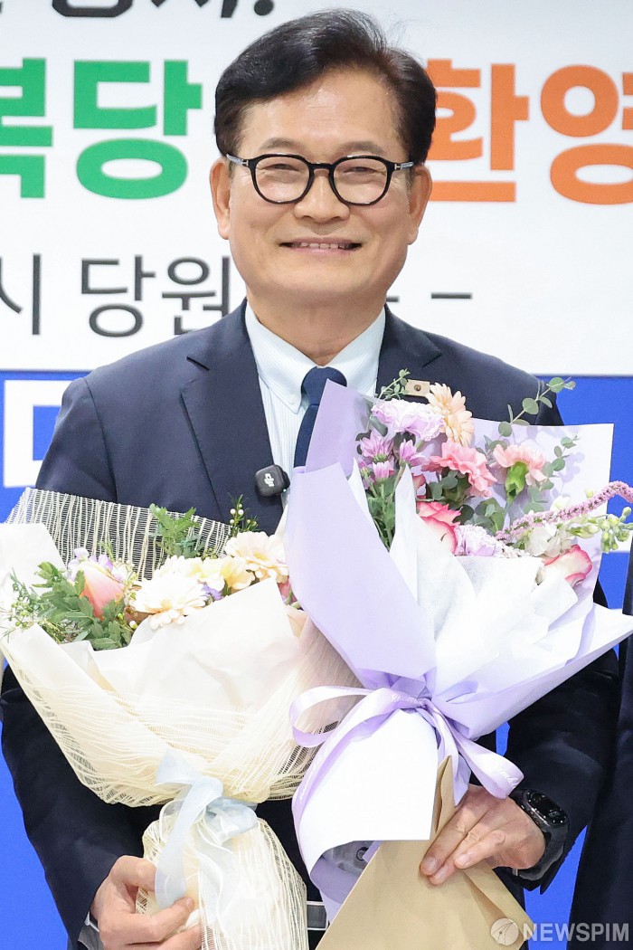 [인천=뉴스핌] 류기찬 기자 = 송영길 전 더불어민주당 대표가 20일 오후 인천 남동구 더불어민주당 인천광역시당에서 복당 원서를 제출한 뒤 당원들로부터 꽃다발을 전달받고 있다. 2026.02.20 ryuchan0925@newspim.com