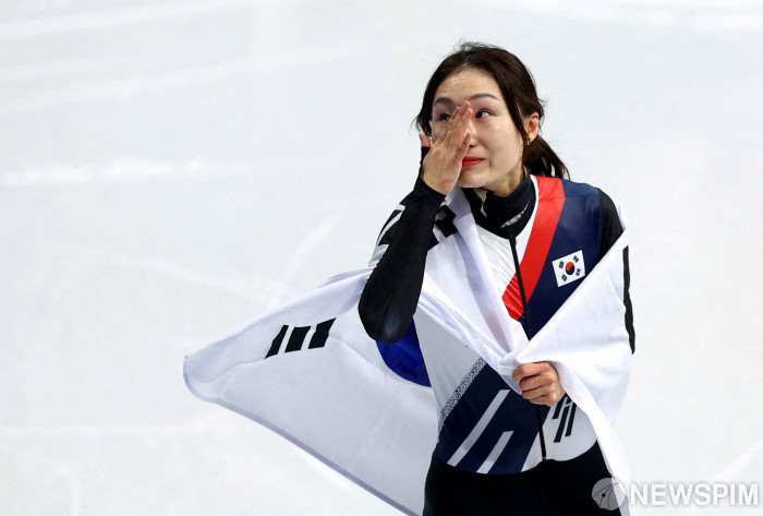 [밀라노=로이터뉴스핌] 밀라노 코르티나 2026 올림픽에 출전한 쇼트트랙 대한민국 최민정 선수가 지난 20일 이탈리아 밀라노 아이스 스케이팅 아레나에서 열린 여자 1500m 결승에서 은메달을 획득하고 눈물을 흘리고 있다. 2026.02.21 photo@newspim.com