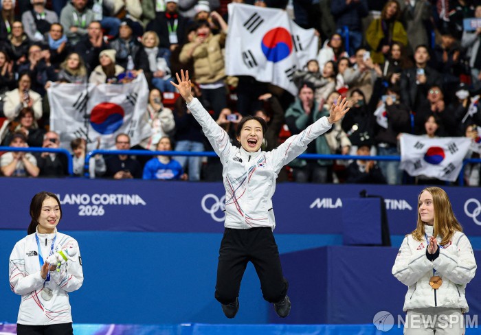 [밀라노=로이터뉴스핌] 밀라노 코르티나 2026 올림픽에 출전한 쇼트트랙 대한민국 김길리 선수가 지난 20일 이탈리아 밀라노 아이스 스케이팅 아레나에서 열린 여자 1500m 시상식에서 기뻐하고 있다. 2026.02.21 photo@newspim.com