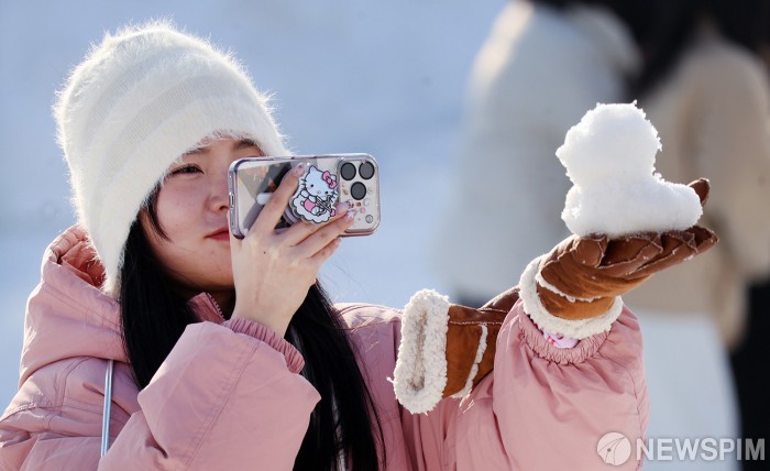 [서울=뉴스핌] 22일 주말을 맞아 평창군 대관령면 횡계리 송천 일대 축제장에서 열린 '제34회 평창 대관령눈꽃축제'를 찾은 방문객이 작은 눈사람을 보며 마지막 겨울축제를 즐기고 있다. 올해 축제는 온화한 날씨에도 불구하고 설연휴 기간 많은 방문객이 몰려 전년도에 비해 방문객 수가 10퍼센트 증가한 12만 3천 여명을 기록, 성황리에 마쳤다. [사진=평창관광문화재단] 2026.02.22 photo@newspim.com