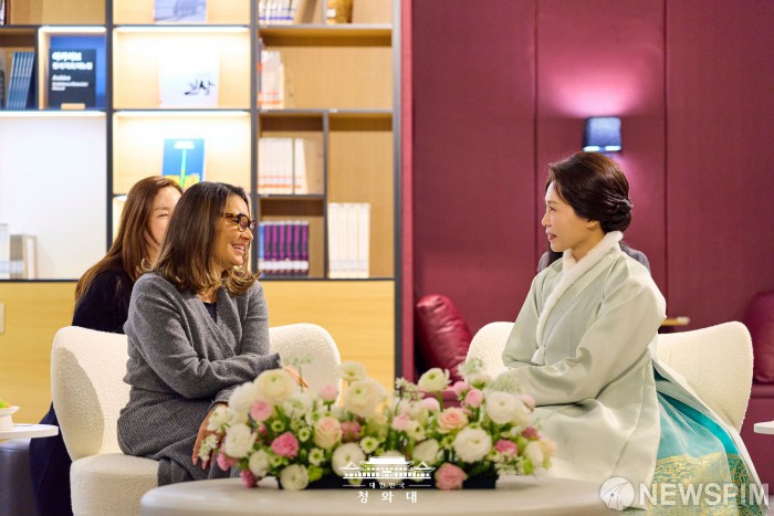 [서울=뉴스핌] 이재명 대통령의 부인 김혜경 여사가 지난 21일 경기 파주 국립민속박물관에서 브라질 룰라 대통령의 배우자 호잔젤라 다시우바 여사와 친교 시간을 보내고 있다. [사진=청와대] 2026.02.22 photo@newspim.com