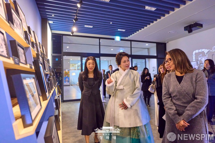 [서울=뉴스핌] 이재명 대통령의 부인 김혜경 여사와 브라질 룰라 대통령의 배우자 호잔젤라 다시우바 여사가 지난 21일 경기 파주 국립민속박물관을 둘러보고 있다. [사진=청와대] 2026.02.22 photo@newspim.com