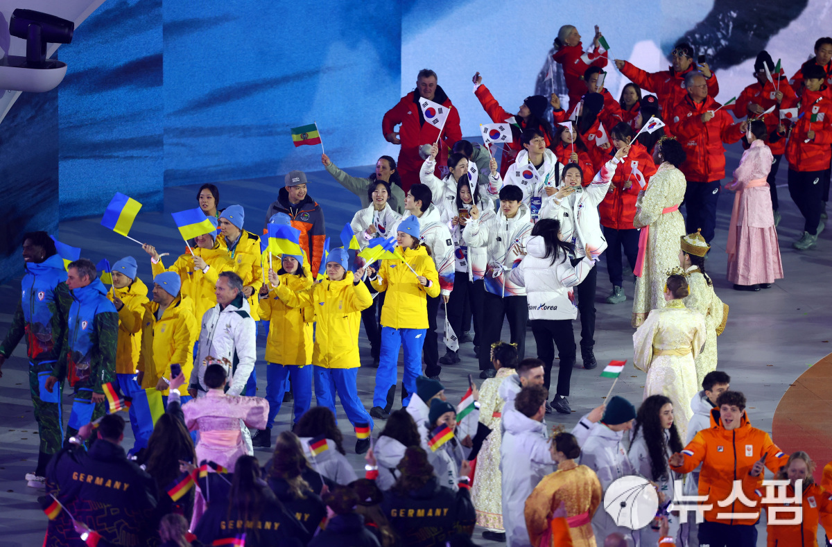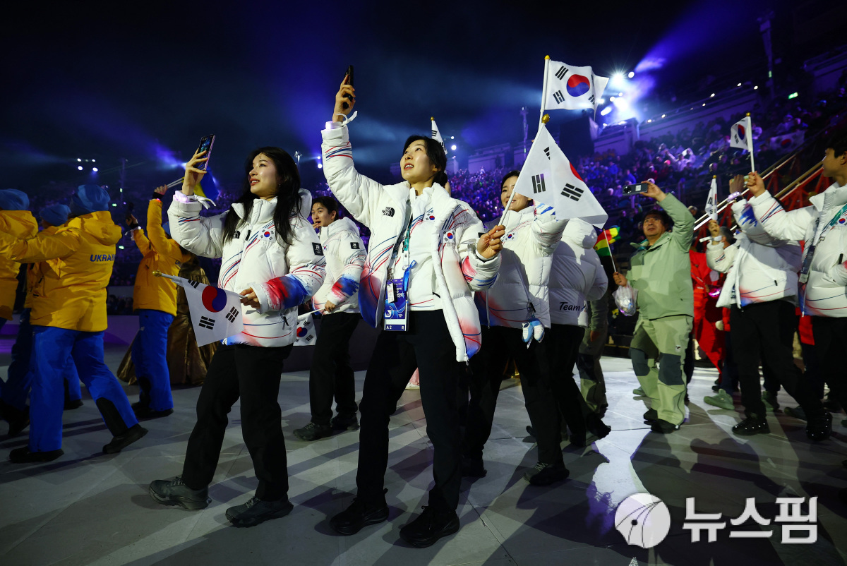 [서울=뉴스핌] 남정훈 기자 = 17일 간의 겨울 축제를 즐긴 한국 선수단이 쇼트트랙 최민정(성남시청)과 황대헌(강원도청) 두 기수를 앞세워 2026 밀라노·코르티나담페초 동계 올림픽 폐회식에 입장했다.