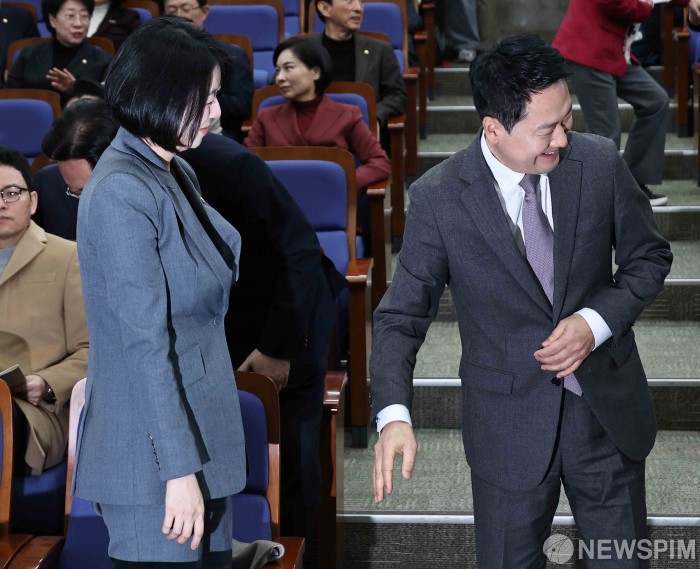 [서울=뉴스핌] 윤창빈 기자 = 장동혁 국민의힘 대표가 23일 오전 서울 여의도 국회에서 열린 의원총회에서 배현진 의원과 인사를 마치고 돌아서고 있다. 2026.02.23 pangbin@newspim.com